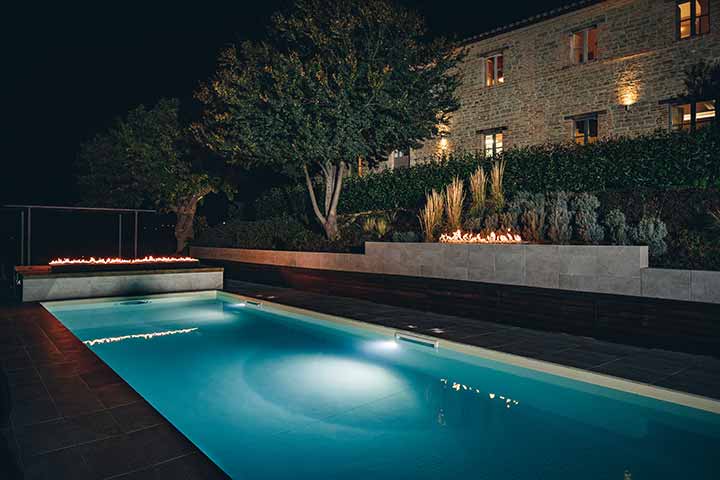 Extravagante Gestaltung mit einem Gasfeuer von Flammengarten für den Außenbereich und von Deco Gasfeuer für den Innenraum.